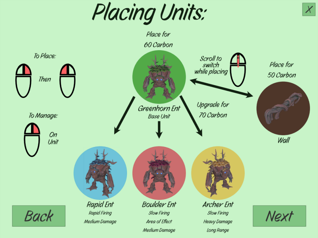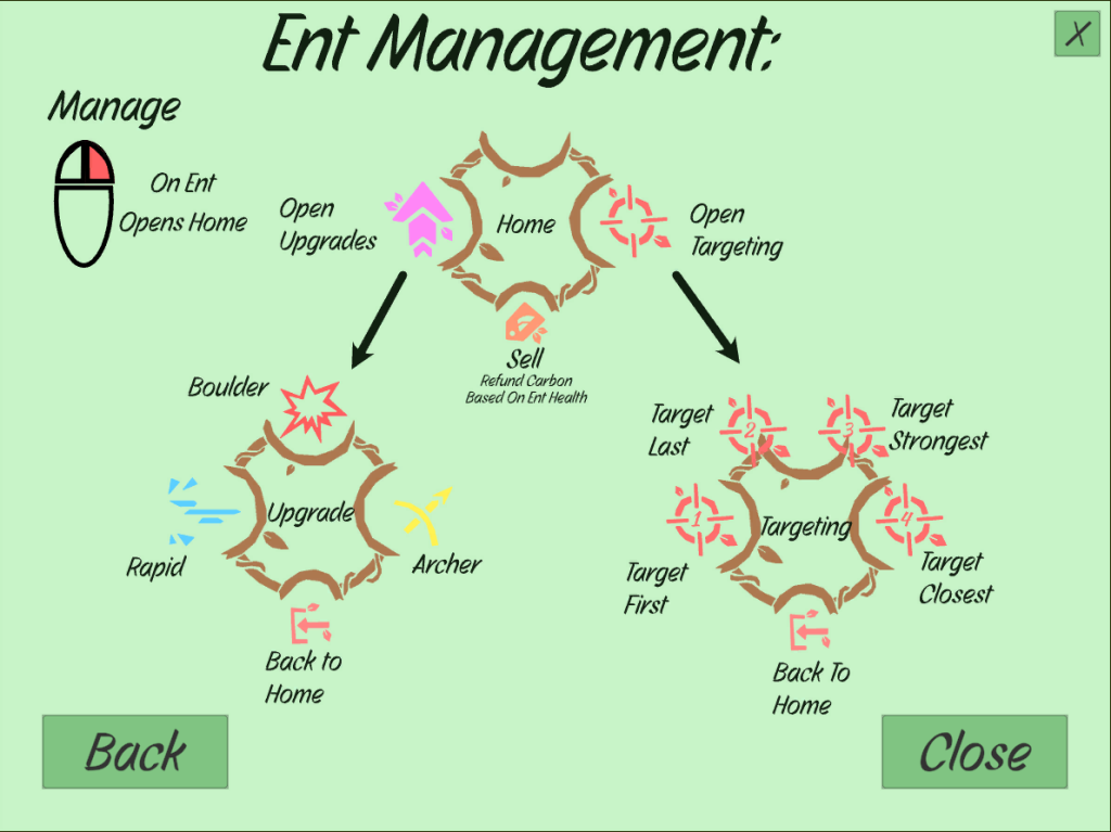 I designed the towers to upgrade based on stages rather than pure stats. The tier 1 tower, Greenhorn Ent, acted as a base for all the others. Each upgrade is a objective improvement on the last tier, but has clear advantages and disadvantages compared to other tower types of the same tier. The stats and features of the towers were calculated, displayed, and updated throughout the development and testing of the game.