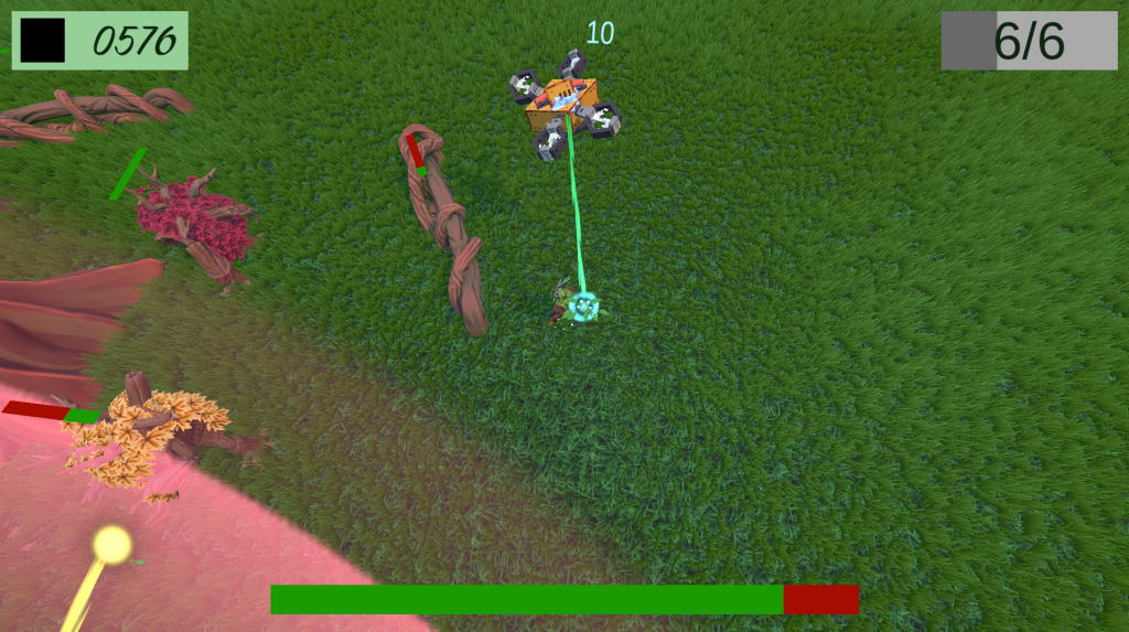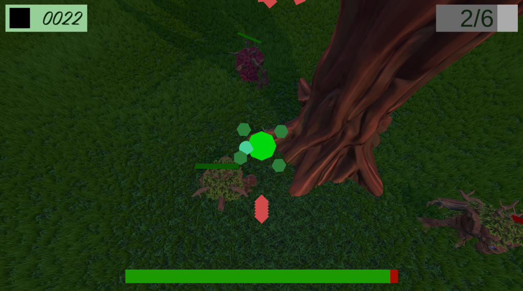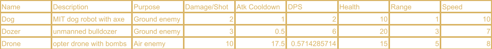 Similarly, enemies were also calculated and documented in a spreadsheet. Enemies were designed to pose different challenges to the player’s defenses. Certain enemies require sufficient crowd control while others require focused bursts of damage. The drone in particular was designed to subvert standard defenses by flying over walls and only targeting attack towers and The Great Tree. Enemies were made to navigate to the central defense point from any angle as opposed to other tower defense games that send enemies on designated paths.
