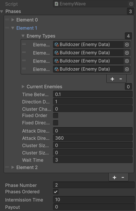 Waves are created through a Scriptable-Object based phase system where phases are set with enemy types, enemy intervals, direction of attack (or no fixed direction), direction deviation, enemy cluster data, and time till next phase. This system allows for precise creation of waves with specific experience goals as well as controlled deviations.